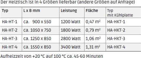 Anwendungsmöglichkeiten Formenbau, Automobilbau, Holz- und Papierindustrie, Buchbinder eien, Kunststoffindustrie. Auf dem fahrbaren Heiz- und Kühltisch, können verschiedene Materialien wie Kunststoffe und Metalle auf eine gleichmäßige Temperatur gehalten bzw. erwärmt werden. Die Heizplatte besteht aus Aluminium und über das eingebaute elektronische Regelgerät ist die Temperatur stufenlos bis 100 °C einstellbar. Mit dem speziellen Intergral Regelgerät HTI16 wird die Temperatur über die gesamte Fläche der Heizplatte erfasst und kann somit eine viel gleichmäßigere Oberflächentemperatur gewährleisten, als mit einer konventionellen Fühlerregelung. Optional kann der Heiztisch mit einer zusätzlich eingebauten Kühlplatte ausgestattet werden, damit können Abkühlprozesse mit Flüssigkeiten, als auch mit Pressluft beschleunigt werden. Hierfür ist ein separates Kühlgerät bzw. ein Pressluftanschluss kundenseitig notwendig.