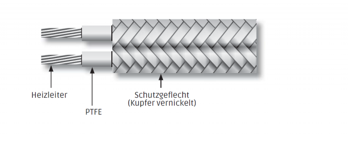 Bei diesem sehr schmalen Heizband sind zwei PTFE-isolierte Heizleiter mit Schutzleiter und einem gemeinsamen Geflecht ummantelt und spritzwasserdicht. Zur Temperaturregelung können wir unseren HTI-Integralregler empfehlen, der ohne Sensor über den Heizleiter regelbar ist. Weitere Informationen siehe Kapitel Regeltechnik.