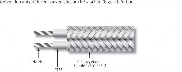 Bei diesem schmalen Heizband sind zwei PTFE-isolierte Heizleiter mit einem gemeinsamen Geflecht ummantelt und spritzwassergeschützt. Durch die hohe Leistung können große Rohre und Behälter mit relativ kurzen Heizbändern beheizt werden.